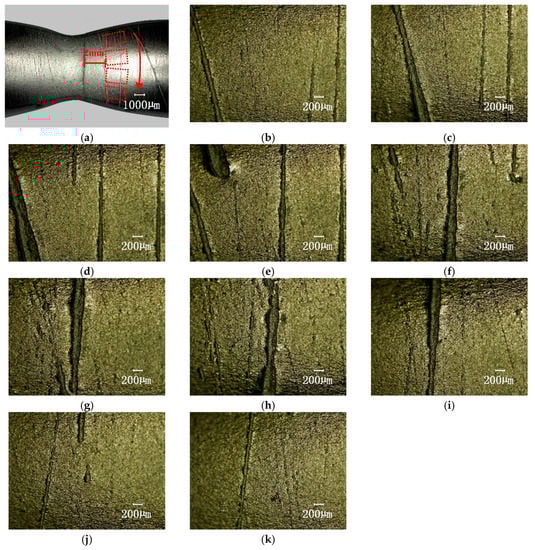 The surface images of the specimens were further observed by using an optical scanning microscope. The 100× lens was selected and the following photographing parameters were set: the contrast ratio was 42, edge enhancement was 2.1, and brightness was medium. In order to avoid the differences caused by the photographic field of view, the photos were taken from a uniform distance of 2 mm from the fracture and the specimen was rotated in a circle (360 degrees, 36 degrees per 1 frame). Figure 7a is a schematic diagram of the photographic sequence. Figure 7b–k are photomicrographs (the vertical is the annular direction of the specimen) of the surface at the neck area adjacent fracture of the specimen after the consumed life of = 75% of pre-fatigue.