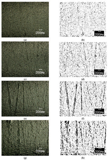 The surface topography of the area adjacent to the fractures of the specimens after pre-fatigue at a strain amplitude 0.005 and its binary image. (a) = 0%, original image; (b) = 0%, binary image; (c) = 33.3%, original image; (d) = 33.3%, binary image; (e) = 50%, original image; (f) = 50%, binary image; (g) = 75%, original image; (h) = 75%, binary image.