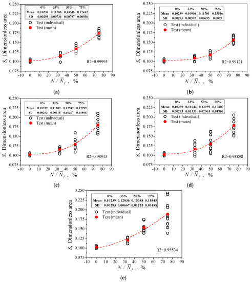 Figure 9 shows the variation of the parameter with the increase of at different strain amplitudes. In the figure, the black hollow dots represent the individual test values for different views in a circle, and the red solid dots represent their statistical mean. They show that each mean curve increases monotonically with , which reflects the irreversibility of damage accumulation with cyclic loading. The dispersion of the S value became larger with an increase in consumed life, mainly because the fatigue damage distribution was not uniform, and it increased with the pre-cycle number.