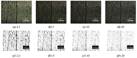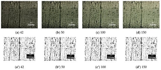 The surface topographies under different contrasts with corresponding binary images (100× magnification). The contrast ratios are respectively taken as: (a) and (a’) 42; (b) and (b’) 50; (c) and (c’) 100 and (d) and (d’) 150; for original image and the corresponding binary image, respectively.