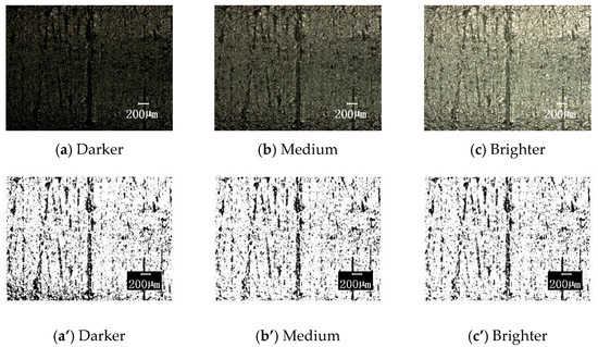 The surface topographies under different brightness levels with corresponding binary images (100× magnification). The parameters of brightness level are respectively taken as: (a) and (a’) Darker; (b) and (b’) Medium and (c) and (c’) Brighter; for original image and the corresponding binary image, respectively.