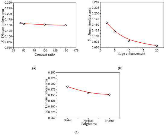 The above results are obtained with the selected photographic parameters selected of acontrast ratio of 42, edge enhancement of 2.1, and medium brightness. In order to understand the influence of these three photographic parameters on the image processing results, the following comparisons were made on each parameter variation (the other parameters were unchanged): (1) The contrast ratios were 42, 50, 100, and 150, the original image and the corresponding binary image are shown in Figure 10; (2) the edge enhancement parameters were 2.1, 5, 10, and 20, the original image and the corresponding results are compared in Figure 11; (3) the brightness is darker, medium, and brighter, and the results are shown in Figure 12. Figure 13 shows the effect of these parameter selections on the numerical results of image processing. It can be seen from the figure that the difference in contrast ratio had little effect on the data of parameter , see Figure 13a. The edge enhancement parameters had a great influence on the data results, see Figure 13b. The brightness change from darker to medium had a greater impact on the results, while the effect of the change from medium to brighter was less, see Figure 13c. These results show that in order to reduce the dispersion of the resulting data and human intervention, uniform imaging parameters (especially edge enhancement parameters) are required for image processing.