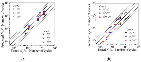 In Figure 9, the curves measured at the strain amplitudes of 0.01 and 0.004 were respectively the highest and lowest of all curves, that is, their deviation from the mean was the largest. If these two curves are used to calibrate the parameters of Equation (5) separately, the error of the predictions mentioned above will be the largest. Therefore, if the largest error of the prediction result is still within the allowable range, it indicates that the method is reasonable and effective. Table 8 lists the number of cycles N of the three sets of cycle tests under different strain amplitudes, and includes N′, N″, and N‴ which correspond to the different numbers of cycles, the corresponding value of parameter ( S′, S″, and S‴), and the relative life predictions N′f, N″f, and N‴f obtained by the parameters of Equation (5) calibrated at strain amplitudes of 0.01 and 0.004, and the remaining life prediction ,, , and the mean prediction, , for N′f, N″f, and N‴f. The error comparison between the predicted value and the corresponding measured value is showed in Figure 14. The abscissa of the graph is the measured fatigue life, and the ordinate is the predicted life; the thick solid line in the figure represents the ideal prediction, and the area with dotted line on both sides represents the interval of a factor of 2, and the area with thin solid lines on both sides represents the interval of a factor of 3. The solid triangles pointing downwards and pointing upwards are the predictions given by Equation (5) for the calibration of the measured data under = 0.004 (Case 1) and = 0.01 (Case 2), respectively. It can be seen from Figure 14a that the predicted life was determined to be within the reasonable double factor region compared to the actual measurements, regardless of whether the parameters of Equation (5) were determined under Case 1 or Case 2. As the number of pre-cycles increased, the fatigue life predicted value was closer to the measured value. From Figure 14b and Table 8, it can be known that the parameters of Equation (5) were determined under Case 2 to predict the remaining fatigue life for pre-fatigue at a strain amplitude of 0.004, or the parameters were determined under Case 1 to predict the same at a strain amplitude of 0.01. The predicted remaining fatigue life had an error rate exceeding twice the actual measurement, but was within a factor of 3. For cycles at other amplitudes, whether the parameters were determined under Case 1 or Case 2, the predictions of remaining fatigue life were still within the reasonable area of a factor of 2. Considering that the prediction was made according to the curve with the maximum deviation and the fatigue tests with dispersion, the rationality and validity of the results are acceptable. It should be pointed out that: (1) the measured remaining life in Figure 14b refers to the value using the measured mean cycle life of Table 3 minus the measured pre-fatigue cycles; and (2) the predictions give an overestimation of fatigue life and remaining life in Case 2 and an underestimation in Case 1.