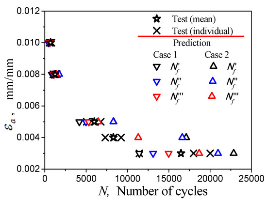 The forecast data N’f, N’’f, and N’’’f for presented in Figure 14 are also listed in Table 8. The relationship between strain amplitude and predicted life can be seen in Figure 15. From Figure 15, the lower and upper boundary of the estimations for the predicted lifetimes of the tests at different strain amplitudes, in which the parameters of Equation (15) are identified under the conditions Case 1 and Case 2, can be observed. Based on the measured data in the figure, the rationality of the method for predicting the low-cycle fatigue life of the material can be preliminarily confirmed.