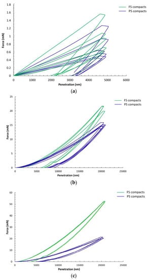 The load–displacement curves measured on FS and PS samples using Berkovich, D600, and D2000 spheres are shown in Figure 1. The curves measured with Berkovich tips (Figure 1a) show a large scattering for both of the tested materials. Tests with D600 and D2000 (Figure 1b,c) spheres led to a much better repeatability of the load–displacement curves. Then, a clear distinction can be made between FS and PS compacts with a higher hardness for FS pellets as compared with PS, which was emphasized in the tests with D2000 spheres. The comparison of load–displacement curves for the three different tips shows a large influence of tip characteristics on the residual penetration depth after unloading (Figure 1). The Berkovich test led to larger irreversible fractions, which were illustrated by a large residual penetration depth compared with the maximum penetration depth. The irreversible energy fractions were lower in tests with D600 spheres, and even lower in tests with D2000 spheres. The latter show a strong elastic behavior, as illustrated by the evident elastic recovery during unloading with a limited residual penetration depth.