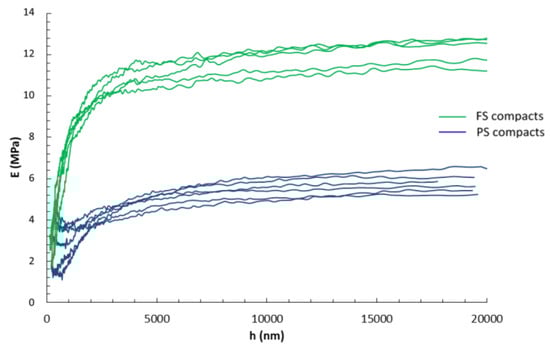 The Young’s modulus versus penetration depth (CSM mode) in the D2000 tests is shown in Figure 2. The average modulus was extracted in the plateau region, which was above 5 µm of penetration depth, thus avoiding the influence of the surface roughness of the samples. The higher rigidity of the FS compacts as compared with PS ones was clearly demonstrated.