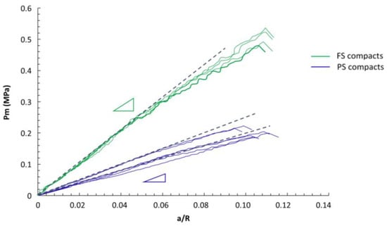 In terms of hardness, tests with Berkovich tips led to much higher values as compared with spherical tests. As spherical tests led to non-unique hardness values, the hardness indicated in Table 3 for the spherical tests corresponds to the pressure at the end of the elastic domain in the contact stress–strain curves (see Figure 3). Tests with D600 and D2000 spheres led to slightly different values of pressure for PS compacts, whereas for FS compacts, the values were identical. The comparison between FS and PS confirmed the large difference in properties already noted for the Young’s modulus, with a higher hardness for FS compacts, which was particularly evidenced for tests with D2000 spheres (FS pellets more than twice as hard as PS ones), and slightly less pronounced for tests with D600 spheres and Berkovich tips (FS pellets 40% harder than PS ones).