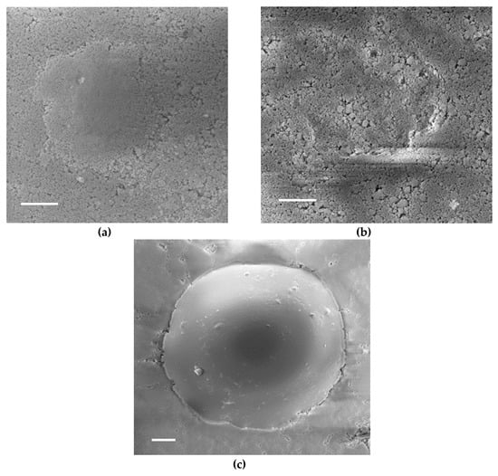 Figure 4 illustrates the residual imprints observed with SEM. The high level of porosity gives a heterogeneous surface aspect with some charging effect, making the observation delicate, especially for tests with D2000 with a strong elastic recovery at unloading and a small residual depth. No pile-up was noted around the residual imprints, whatever the tip geometry. No macrocracks were found at the corner of Berkovich residual imprints (Figure 4d,e). Spherical imprints did not show macrocracks; however, ring cracks could be noted above a threshold load (approximately 10 mN for tests with D600) on FS samples (Figure 4c), but not on PS samples.