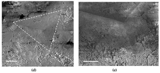 Images of residual indents: (a) D600 sphere on an FS compact, load 6 mN, (b) D600 sphere on a PS compact, load 6 mN, (c) D2000 sphere on an FS compact, load 50 mN, (d,e) Berkovich on an FS compact, load 1 mN (dotted lines in d added as guidelines). Scale bar: (a) 20 µm, (b) 20 µm, (c) 20 µm, (d) 20 µm, and (e) 10 µm.