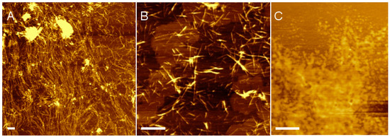 To confirm nanofiber self-assembly, hydrogels prepared from pristine (RADA)4 and the blend of 75:25 (RADA)4:(RADA)4K5 were analyzed by atomic force microscopy (AFM). It was unnecessary to analyze both the 1 and 5% peptide concentrations since all AFM samples were significantly diluted, and the final concentration would be equal regardless of the initial peptide concentration in the hydrogel. Figure 1 shows AFM images of nanofiber morphology at 0.01% (w/v) total peptide concentration in 10 mM phosphate buffer, pH 7.4. Indeed, both pristine (RADA)4 (Figure 1A) and the lysinated blend (Figure 1B) self-assembled into nanofibers. As expected, (RADA)4K5 alone did not form nanofibers but collapsed into random aggregates (Figure 1C). The length of pristine (RADA)4 nanofibers ranged from hundreds of nanometers to several micrometres (sampled across 5 areas and 3 independent experiments). The 10.3 ± 1.5 nm width and 1.3 ± 0.3 nm height of nanofibers were consistent with previously reported dimensions [34]. In contrast, the nanofibers of the 75:25 (RADA)4:(RADA)4K5 blend were 347 ± 201 nm in length, though not statistically shorter than those of pristine (RADA)4, and comparable in width (17.7 ± 3.3 nm) and height (1.4 ± 0.2 nm). Therefore, while both the pristine and lysinated blend of (RADA)4 could self-assemble into nanofibers, the lysine moieties in (RADA)4K5 may limit nanofiber length.