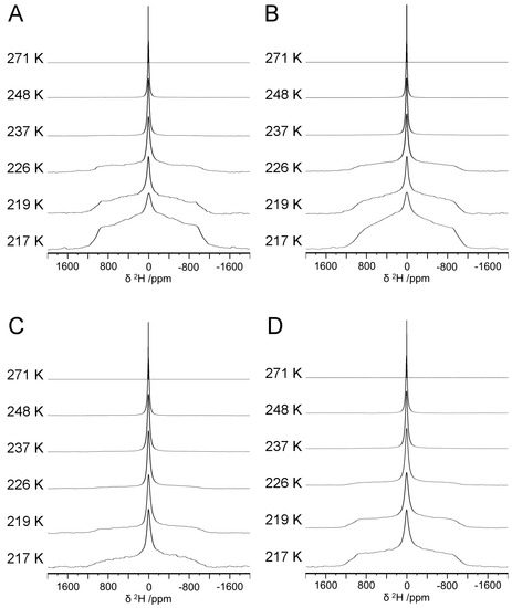 Solid–state 2H NMR experiments were performed at 11.75 T (v0 = 76.8 MHz) on a Bruker Avance 500 spectrometer using a Bruker 4 mm double resonance probe. Samples were packed in zirconia rotors (4 mm outer diameter) and acquired under non-spinning conditions. 2H NMR spectra were obtained with a solid-echo pulse sequence with 5.0 μs 90° pulses, a 30.0 μs interpulse delay (τ1), a 60 ms acquisition time, and a 2.0 s recycle delay. Data were left-shifted to ensure the free induction decays began at the maximum. Variable-temperature NMR data were obtained on the Avance 500 NMR spectrometer using a BVT3000 variable temperature unit. The heat exchanger source was an ethanol/dry ice bath, with dry air as the VT gas. Gas flow rates of 1070 and 1470 L/h were used to reach the target temperatures. Temperature calibrations were performed according to established methods using methylammonium lead chloride 207Pb chemical shifts [28]. The NMR spectra were simulated using the WSolids NMR Simulation Package (Version 1.21.3; Universität Tübingen, Tübingen, Germany) to quantify the mobile water in hydrogel samples [29].