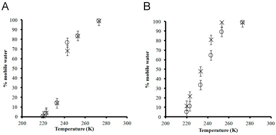 Non-spinning 2H NMR spectra were used to quantify (peak areas) the relative mobile water content as a function of temperature in the hydrogels (A) × 1K0 and ○ 1K25 and (B) × 5K0 and ○ 5K25. The mobile water content is expressed as a percentage of the initial water content at room temperature.