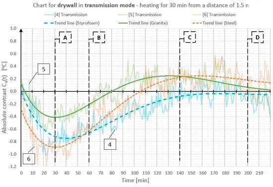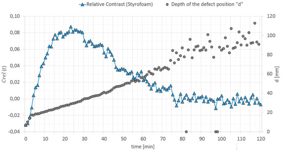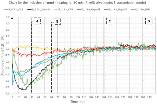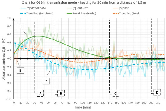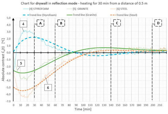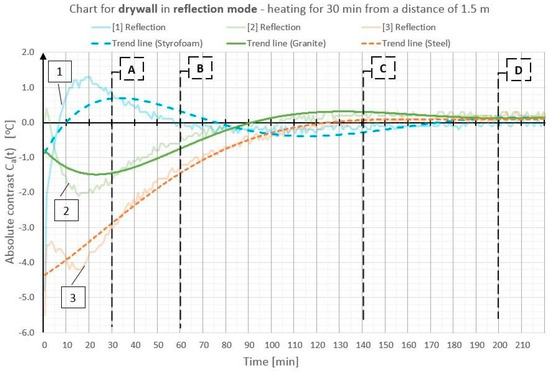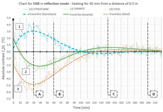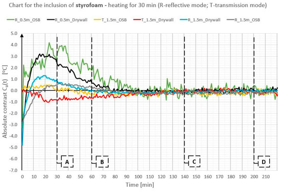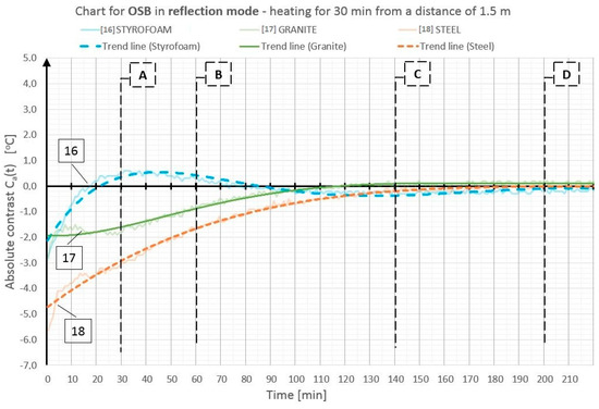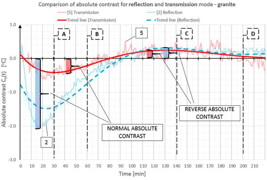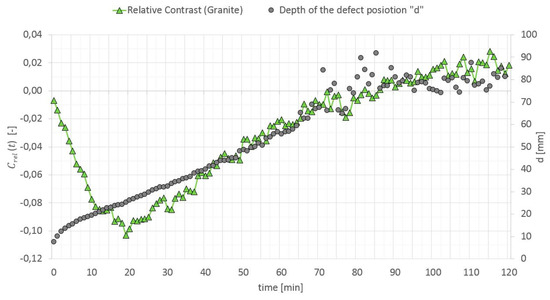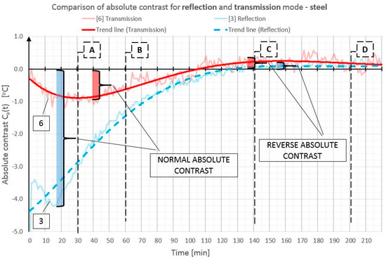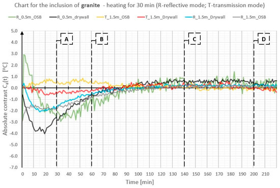 - Approximately 90 min after the heating source is switched off, the second phase of cooling down takes place. In this phase, an inverse absolute contrast appears—the sign of the contrast changes and the inclusions initially visible as a warmer area are perceived as cooler areas, and vice versa (this phenomenon occurs on the same side of the partition);