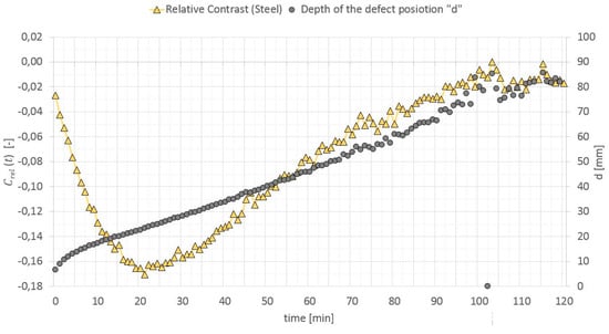- —the relative contrast in relation to the reference area (the cross section with the defect) [-].