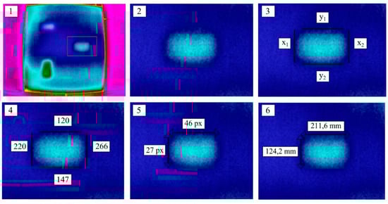 - Knowing the specifications of the thermal imaging camera lens (the size [in mm] of 1 pixel in the thermogram), one can estimate the size of the defects present inside the partition by indicating the place in the thermogram where the defect’s edges are likely situated.