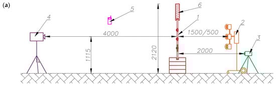 Schematic of test stand (given units in mm): (a) side view and (b) top view. Designations in the figure: 1—tested partition model, 2—infrared radiator, 3—thermal imaging camera Optris PI400, 4—thermal imaging camera Flir P65, 5—air temperature and relative humidity sensor, 6—Styrofoam band.