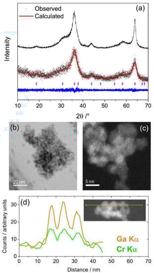 The powder XRD pattern of chromium substituted gallium oxide shows a highly broadened diffraction profile that can be indexed and fitted to cubic space group Fd3m, as shown in Figure 1a. The refined lattice parameter a = 8.233(2) Å is very similar to nanocrystalline γ-Ga2O3, which has a reported value of a = 8.2440(2) Å [13]. This is unsurprising given that the Cr3+ cation is very similar in size to the Ga3+ cation in an octahedral environment (0.615 Å for Cr3+ and 0.62 Å for Ga3+) [22]. The extremely broad Bragg reflections suggest a poorly crystalline material consisting of very small particles, and high-resolution transmission electron microscopy (HR-TEM) imaging confirms the small particle size with individual crystallites having a size around 5 nm in diameter, as shown in Figure 1b,c. Atomic resolution images show that the material has ordered crystalline lattice fringes, as shown in Figure 1b. EDS measured on the TEM confirmed the ratio of chromium to gallium in the spinel as approximately 3:7. As noted in the experimental section, this material represents the composition limit: no higher chromium content was achieved by this synthesis method. The homogeneity of distribution of Cr and Ga was proved by EDS line-scans, as shown in Figure 1d.