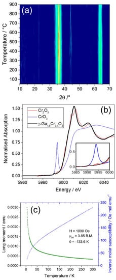 (a) In situ thermodiffractometry of γ-Ga1.4Cr0.6O3 showing lack of structure collapse to 900 °C; (b) Cr K-edge X-ray absorption near-edge spectroscopy (XANES) spectra of γ-Ga1.4Cr0.6O3 and two crystalline standards with (inset) showing the lack of a pre-edge feature in the spinel; (c) field cooled (FC) magnetometry of γ-Ga1.4Cr0.6O3 (green) showing simple paramagnetic behaviour, and inverse susceptibility (blue).