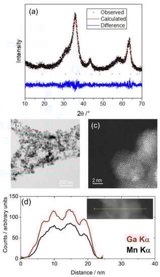 The room temperature powder XRD pattern of the manganese gallium oxide material prepared is shown in Figure 3a. Very broad Bragg reflections suggest nano-sized particles, which was confirmed by TEM imaging, as shown in Figure 3b,c. The material prepared was apparently less crystalline than the pure nano-crystalline γ-Ga2O3 (prepared by a similar solvothermal reaction). The powder pattern can be indexed, and the profile fitted to a cubic spinel group with space group Fd3m, and a Pawley refinement of the lattice parameter showed an increase in the unit cell size compared to pure γ-Ga2O3 prepared by a similar solvothermal reaction, (8.297(4) cf. 8.258 Å, respectively). This is consistent with the larger size of the Mn2+ cation than the Ga3+ (Mn2+: 0.66 Å (tetrahedral), 0.83 Å (octahedral) cf. Ga3+: 0.47 Å (tetrahedral), 0.62 Å (octahedral) [22]), but is a smaller lattice parameter than reported for MnGa2O4 prepared by a high temperature synthesis (8.435 Å) [24]. A difference in the cation distribution in this poorly crystalline material prepared solvothermally compared to the arrangement prepared from high temperature synthesis could account for this observation (see below for further discussion).