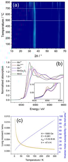 (a) In situ thermodiffractometry of manganese gallium oxide showing phase separation at 500 °C to Mn2O3 and then formation of β-Ga2O3 around 750 °C, (b) Mn K-edge XANES spectra of manganese gallium oxide with relevant reference samples, (Mn2+-Mn(NO3)2·4H2O; Mn2.67+-Mn3O4; Mn3+-Mn(acac)3) and (c) field cooled magnetometry of a sample of manganese gallium oxide (orange) displaying simple paramagnetic behaviour and inverse molar susceptibility (blue).