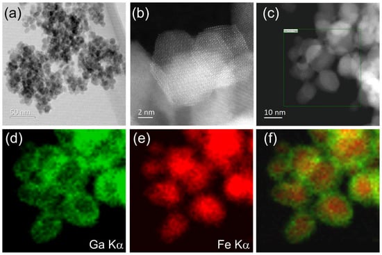 The sample prepared with a 1:1 ratio of Fe:Ga shows even more dramatic evidence of phase separation, with core-shell structures evident in EDS maps, as shown in Figure 6. This reveals gallium-rich shells on iron-rich cores even within the smallest particles of 2–3 nm in dimension.