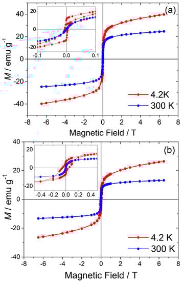Hysteresis curves measured at 4.2 K (red) and 300 K (blue) of Fe substituted γ-Ga2O3 for samples (a) Fe:Ga 1:1 and (b) Fe:Ga 3:7. The insets show expansion of the curves in the low-field region.