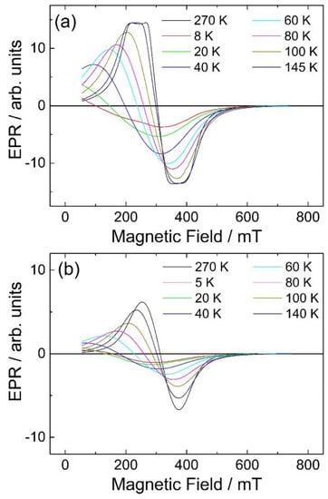 Electron paramagnetic resonance (EPR) experiments were performed on a commercial (MiniScope 400, Magnettech, Berlin, Germany) X-band (9.44 GHz) EPR spectrometer coupled to helium flux cryosystem (ESR 900, Oxford Instruments, Abingdon, UK) permitting sample temperatures to be varied between 4.2 and 350 K. Powdered samples were measured inside borosilicate tubes (Wilmad-LabGlass, Vineland, USA).