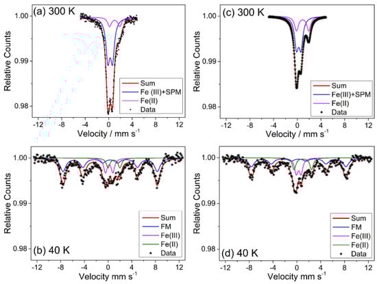 The important point of this analysis is that the doublet structure observed at room temperature in both samples with isomer shift δ of about 0.25(1) mm s−1 and quadrupole shift of about 0.77(2) mm s−1 was dominantly due to superparamagnetic particles, which was transformed into a sextet structure at 40 K with isomer shift δ of about 0.37(2) mm s−1, zero quadrupole shift and hyperfine interaction of 49.3(1) T [34]. The sextet parameters are typical for magnetite (Fe3O4) nanoparticles below the Verwey transition (~122 K) for which the individual tetrahedral and octahedral Fe sites cannot be distinguished [35].