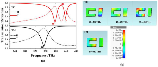 (a) The transmission and reflection spectra of the single-layer EIT structure at the normal incidence. (b) Electric field distributions of the resonant frequencies at f1 = 396 THz, f2 = 420 THz and f3 = 436 THz for the Transverse Electric (TE) polarization, and f4 = 353 THz for the Transverse Magnetic (TM) polarization.