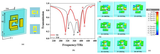 As a result, a transparency window appears in the transmission spectra. For the TM polarization, there is only one dip at f4 = 353 THz. Based on the distribution of the electric field on the bottom layer, the radiation of the U-shaped resonator is apparently working as a bright mode [21,27,28].