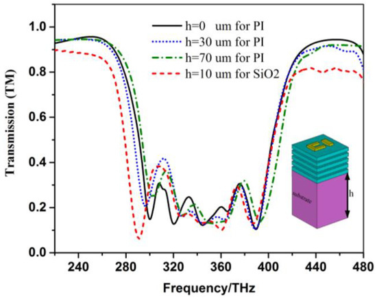 For the five-layer structure, the whole thickness is only 300 nm, therefore a substrate is needed for this ultrathin device in practice. Figure 11 shows the transmission spectra of the five-layer system on the substrate of polyimide (PI) and SiO2 for the TM polarization at normal incidence. For the SiO2, the relative permittivity εd = 4.41 and tangential loss tgδ = 0.0004 [31] are used in the simulation. The solid, dotted and dot-dashed lines correspond to the results of thickness of substrate PI h = 0, 30 and 70 um, and it is also seen that the property of broad stopband still exists except for a little frequency shift and increase of magnitude in the stop band for the five-layer structure. If SiO2 with h = 10 um is used as the substrate, the stopband on the left side shifts to the lower frequency because the increase of the dielectric constant of the whole structure will lead to the decrease of the frequency of the modes according to the variational principles [32,33]. To fabricate the multilayer metamaterial structure, we can firstly get the single-layer EIT structure on the substrate by using electron-beam lithography [24]. As the resolution of the electron-beam lithography system can be controlled within 10 nm [34], the dimensions of the EIT structure given in Figure 1 can be realized in experiment. The multilayer structure can finally be formed by repeating the procedure of single-layer fabrication several times [35].