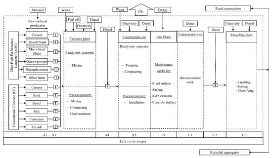 For the deconstruction life cycle stage, C1, crowbar, excavator loader, hydraulic hammer, wheel loader, and cutters are assumed to be used; They require a diesel consumption of 17.6 L/m3 in terms of CC [65]. To consider the higher performance of UHPC the fuel consumption is doubled resulting in 35.2 L/m3 according to the experts’ interviews. A milling machine with 2.54 L/m3 diesel demand could be used for the deconstruction of the road surface, and the deconstruction of the sealing could be done using an excavator with 0.20 L/m2 diesel demand and 0.13 L/m2 liquefied petroleum gas demand [65]. The construction waste is sorted by material and transported, C2 life cycle stage. The transportation is assumed to be done by truck (27 t payload) over a distance of 30 km) to the recycling plant [50]. Life cycle stage of C3 represents treatment of the construction waste. LCA is modeled for the needed wheel loader, excavator, and other processes in relation to waste plant. In terms of CC, the processes needed are a wheel loader with 0.60 L/m3 diesel demand, excavator with 0.30 L/m3 electricity demand of 18.26 L/m3 for other processes within a waste plant [65]. Regarding UHPC, however, the same demand of diesel of the wheel loader is needed, and an additional diesel demand of excavator is needed, i.e., 0.43 L/m3 and simultaneously 21.21 MJ/t of electricity is needed for other processes within the waste plant.