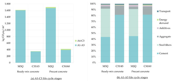 (a) Carbon Footprint of Ultra-High-Performance Concrete (M3Q and M2Q) in comparison with conventional concrete (C35/45 and C50/60) per m3; (b) Share of materials of the carbon footprint for the A1–A3 life cycle stages.