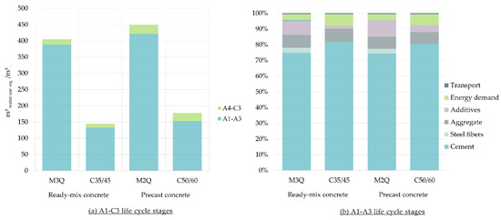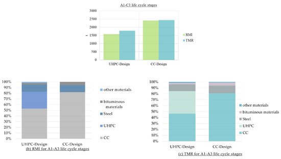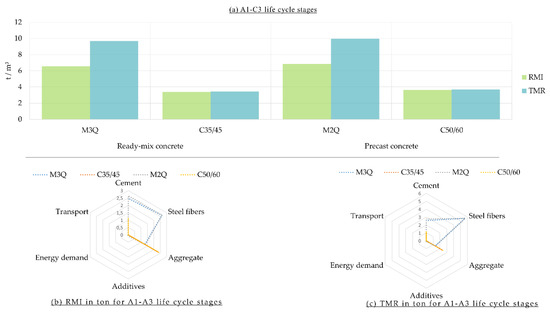 LCA results of the material footprint (measured in RMI and TMR) are shown in Figure 3. The material footprint of UHPC is much higher than that one of the CC. Figure 3 reveals that there has been a marked increase in the values of TMR of UHPC mixtures, i.e., M3Q and M2Q, owing to high value of unused per used extractions of the production of the steel fibers. In terms of life cycle stages A1–A3 of the CC (C35/45 and C50/60), material footprint is mainly dominated by more than 65% from the production process of aggregate and by more than 30% from the production process of cement.