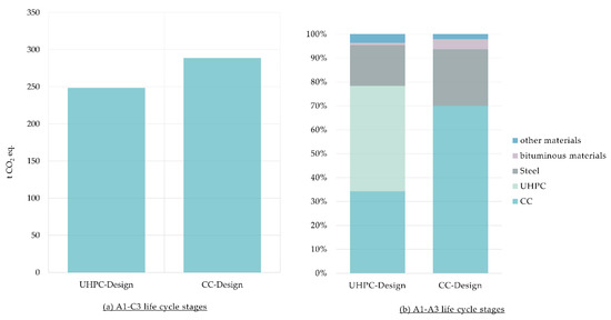 The carbon footprint of the bridge with CC (CC-Design) could be decreased by about 40 t CO2 eq. when the UHPC is considered to enhance the design of the bridge (UHPC Design) as shown in Figure 8. In terms of CC-Design, 63% of the carbon footprint comes from A1–A3 life cycle stages, whereas those stages contribute to 92% of the carbon footprint of the bridge when the UHPC is used. Analysis of A1–A3 stages shows that production processes of CC and steel mainly contribute to the carbon footprint of the CC-Design. On the other hand, production processes of UHPC, CC, and steel dominate GHG emissions of the bridge when UHPC is used altogether with CC (UHPC Design).