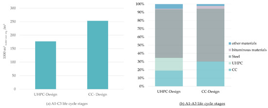 ISO 14040 [67] defined the functional unit of a product system as a measure of the benefit of the functional outputs. However, the environmental footprints of the UHPC in comparison with CC should be provided within the functionality of the final products, e.g., bridges, because UHPC could strongly reduce mass to load-bearing capacity. LCA results for 1 m3 of UHPC in comparison with CC will be discussed in Section 3.1 and Section 3.2 in order to enhance future studies with other applications. The results related to a practical application of UHPC will be shown within the Section 3.3. When analyzing and comparing the life cycle of bridges, a functional unit should represent an equal practical value [65]. LCA results are done for the two design variants of the bridge. The practical value (functional unit) is defined as the whole bridge because two design options are connecting two identical places, assigned to the same bridge class, and having the same load capacity and length.