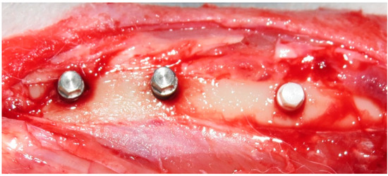 The incision was 10 mm below the articulation in the skin and posteriorly in the fascia in the proximal-distal direction. Three perforations were made using a pilot spade drill with 2 mm in diameter and 5 mm in length with copious irrigation using saline solution. A distance of 10 mm between the three perforations was maintained. Then, the implants were manually installed at the bone level, with the hexagonal portion of the implant head out of the bone (Figure 3), controlled by an experienced surgeon (SAG). The animals were divided into 2 groups of 5 animals, for biomechanical test and histological analysis. Then, the implants were distributed by a randomized protocol (www.randomization.com) inside of the two lots (n = 3 implants per tibia). The suture was performed in two planes (muscular and subcutaneous) using a simple point, with nylon 4–0 (Johnson & Johnson/Ethicon, New Brunswick, NJ, USA).