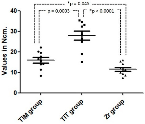 Table 2 shows the maximum removal torque values measured in the Ti and Zr groups. The values in the Zr group were, on average, half those in the Ti group (p < 0.0001). All values measured are presented with the dispersion and median in the graph of Figure 5.