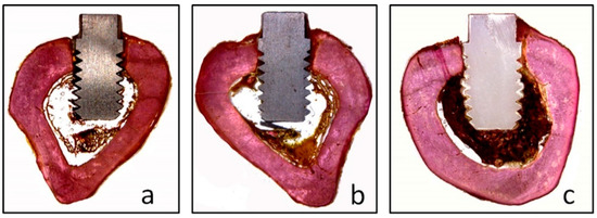 Images of the implants installed in the tibia of the three groups, (a) TiM group, (b) TiT and (c) Zr group.