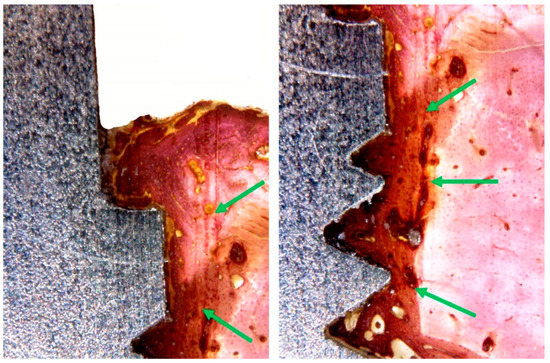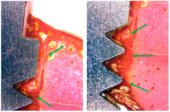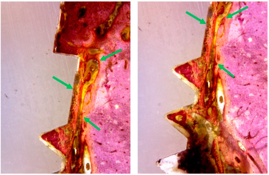 Whereas, in the TiT group, similar to the TiM group, the histological analysis showed bone neoformation in the areas adjacent to the implant surfaces, with regions of bone remodeling, showing evidence of a structural arrangement similar to that of the lamellar region. Around the implants, a superior bone density was observed and a minimum gap in the interface between bone and implant, with a smaller amount of collagen matrix present in these areas (Figure 8).