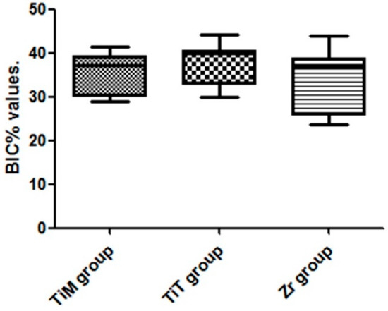 The mean BIC% values in the Ti group were similar to the values of Zr group, showing no statistically significant difference among the groups (Table 3). The distribution of the BIC% values measured is presented in the box plots graph of Figure 10.