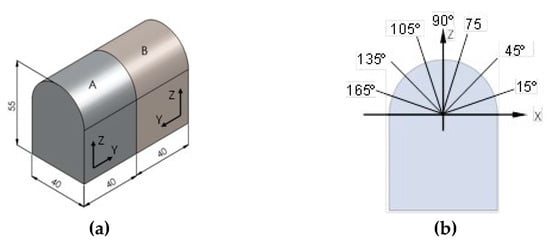 Semi-cylindrical workpieces were machined in order to assess the effect of slope on surface roughness (Figure 2a). The material used for manufacturing the parts was a hot work tool steel W-Nr. 1.2344, hardened steel (50-54 HRC), with an approximate composition of 0.39% C, 1.10% Si, 0.40% Mn, 5.20% Cr, 1.40% Mo and 0.95% V.
