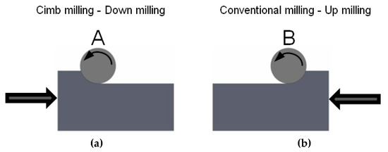Roughness was measured along different generatrices of the semi-cylindrical part in Figure 2a, corresponding to different angular positions (15°, 45°, 75°, 90°, 105°, 135° and 165°) in Figure 2b. Moreover, influence of milling strategy, either climb (down) milling (Figure 3a) or conventional (up) milling (Figure 3b), on surface roughness was also analyzed (Figure 3).