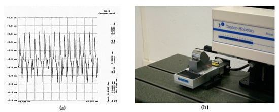 Roughness parameters Ra and Rt were measured using a Taylor-Hobson Form Taylsurf Series 2 profile roughness tester (as Figure 4b shows). An evaluation length of 4.8 mm (6 × 0.8 mm) was used, and a 2 μm radius stylus tip was used in conjunction with a 0.8 Gaussian cut-off filter and a bandwidth ratio of 320:1 to evaluate the Ra and Rt parameters. A stylus speed of 0.5 mm/s was used in conjunction with a 0.8 mN static stylus force and the stylus cone angle used was 90°.