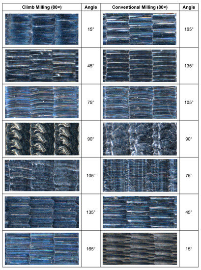 In climb milling, roughness values remain almost constant between 15° and 45° and decrease significantly from 45° to 75° in the ascendant trajectory. Values increase at 90° because of a lack of cutting speed and decrease at 105°. In the descendant trajectory, values decrease slightly between 105° and 135° and remain almost constant between 105° and 165°. In conventional milling, similar results were obtained. As a general trend, lower roughness values were obtained for conventional milling than for climb milling in the ascendant trajectory, and higher roughness values were obtained for conventional milling than for climb milling in the descendant trajectory.