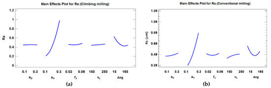 Main effects plot for Ra (considering the position angle) in (a) climb milling and (b) conventional milling.