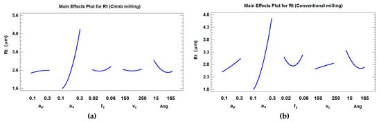 Main effects plot for Rt (considering the position angle) in (a) climb milling and (b) conventional milling.