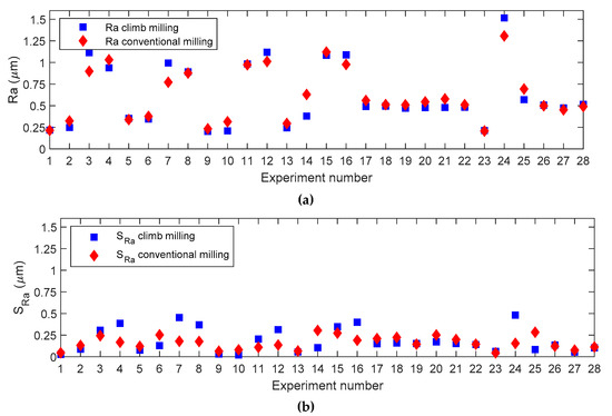 Figure 8a shows that average Ra values are very similar for both climb milling and conventional milling, if the same experiment is taken into consideration. However, in surfaces with variable inclinations, such as those found in injection molds, it is interesting not only to minimize roughness average values, but also its variability for different inclination angles. This will lead to a more uniform surface roughness. Then, in order to minimize variability (Figure 8b), the use of conventional milling is recommended in experiments 3, 4, 7, 8, 11, 12, 15, 16, and 24. Those experiments have a general tendency to exhibit high ae values (ae = 0.3 mm). Using climb milling is recommended in experiments 2, 5, 6, 9, 10, 14, 17, 18, 20, 21, 25, and 27, which in general correspond with low and medium ae values (ae = 0.1 mm and ae = 0.2 mm, respectively).