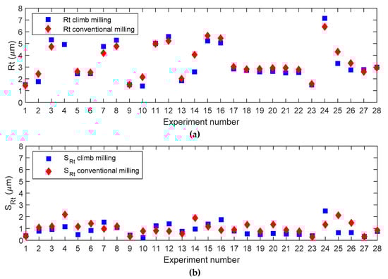 For the remainder of experiments, similar values were obtained for both conventional and climb milling. Figure 9a also shows that average Rt values are similar for both machining strategies. However, variability (Figure 9b) determines that conventional milling is recommended in experiments 7, 11, 12, 13, 15, 16, and 24. As a general trend, those experiments correspond to high ae values (ae = 0.3 mm), with high vc values (vc = 250 m/min). Climb milling is recommended in experiments 2, 3, 4, 5, 6, 10, 14, 17, 18, 19, 20, 21, 22, 25, and 26, which correspond to maximum ae with minimum vc, minimum ae with maximum vc, or medium ae with medium vc values. For the rest of experiments, the values obtained are similar.