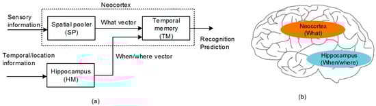 (a) The functional block diagram of Hierarchical Temporal Memory (HTM): The spatial pooler receives the sensory information from various sensory organs and forms the Sparse Distributed Representation (SDR) output representing the collective cortical neurons activated in response to the sensory information. The temporal memory learns the sequence of items that are represented by the SDR vectors by combining the sensory information with the temporal information. (b) The cross-sectional view of the human brain: Here, the neocortex and hippocampus regions are shown for processing the “what” and “when/where” information, respectively.